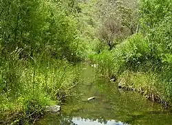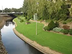 First Creek begins in Cleland Wildlife Park on the western side of Mount Lofty and Crafers, flows north-west through the south-eastern suburbs, past a drop at the Waterfall Gully falls, through Hazelwood and Tusmore Parks, and Marryatville High School, before discharging into the Torrens near Adelaide Zoo. Much of its course through the suburbs has been canalised, some underground.[14] About 7.5% of its flow is diverted as it flows through the Adelaide Botanic Garden to create the First Creek Wetland, a scheme set up to ensure water security and to encourage diversity of flora and fauna in the area, thus helping to maintain healthy urban environments.[15] Botanic Creek runs through the eastern Adelaide parklands from south to north, into the Adelaide Botanic Garden before joining First Creek.[16][17]