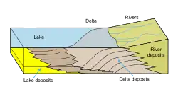 A Gilbert delta (named after Grove Karl Gilbert) is a type of fluvial-dominated[25] delta formed from coarse sediments, as opposed to gently sloping muddy deltas such as that of the Mississippi. For example, a mountain river depositing sediment into a freshwater lake would form this kind of delta.[26] [27] It is commonly a result of homopycnal flow.[23] Such deltas are characterized by a tripartite structure of topset, foreset, and bottomset beds. River water entering the lake rapidly deposits its coarser sediments on the submerged face of the delta, forming steeping dipping foreset beds. The finer sediments are deposited on the lake bottom beyond this steep slope as more gently dipping bottomset beds. Behind the delta front, braided channels deposit the gently dipping beds of the topset on the delta plain.[28][29]