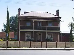 Cattle raising was the major industry in the 1840s with sheep becoming predominant in the 1860s.[26] At this time many Victorians settled in the Riverina to breed sheep and cattle to feed the miners taking part in the Victorian Gold Rush. The herds were considered inferior at first, but these pastures were good for stock, and the land which seemed a desert was actually good fattening country.[36] In the 1860s and 1870s, German settlers from the Barossa Valley travelled upstream to settle in the eastern Riverina. Because of their religious distinctiveness as Lutherans, they preferred to form clustered German settlements.[37] In 1867 and 1868 several land parcels were taken up in the Jindera area.[38] 56 German farmers, in 1869, took six weeks to travel six hundred miles in covered wagons to establish the town of Walla Walla.[39] Nearby Holbrook was originally named Germantown after these settlers until changing its name in 1914 as a result of tensions caused by World War I.[40]