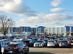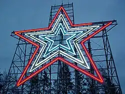 In 1949, the local merchants association erected an 88.5-foot-tall (27.0 m) illuminated star at the top of Mill Mountain in celebration of the upcoming Christmas shopping season.[29] The star was an immediate hit among the city's population, leading to its illumination year-round and earning the city its nickname of "Star City of the South".[30] Despite the popularity boost for the merchants association, shopping habits in Roanoke were becoming more fractured as suburban shopping centers drew patrons away from an increasingly vacant downtown.[31] Crossroads Mall, the first enclosed shopping center in Virginia,[32] and Towers Mall, at the time one of the largest shopping centers in the state,[33] were each completed in 1961.[31] In later years, Tanglewood Mall (1973)[34] and Valley View Mall (1985)[35] contributed to Roanoke's status as the region's retail hub.[36]