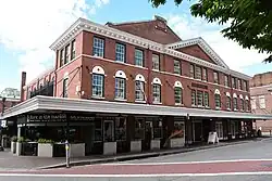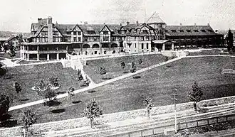 In the early 1880s, Big Lick's residents voted to rename the town "Kimball" after Frederick J. Kimball, an executive for the two railroad companies who played a significant role in their new location.[14]: 10 Kimball turned down the honor, saying, "On the Roanoke River in Roanoke County – name it Roanoke."[11]: 90 The town obliged, officially becoming the Town of Roanoke on February 3, 1882.[13]: 65 The new charter also annexed nearly 2.5 square miles (6.5 km2) of additional land, including the Town of Gainesborough (later shortened to Gainsboro), which by that point had already become the center of the area's African American community.[17][18]: 153 Kimball chose a wheat field north of the railroad tracks and east of Gainsboro for the N&W's new hotel,[13]: 66 and the 69-room Hotel Roanoke – designed originally in the Queen Anne style before numerous rebuilds and expansions gave it its current Tudor Revival appearance – opened its doors in 1882.[14]: 12