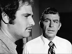 In the late 1960s, Reiner acted in bit roles on several television shows including Batman, That Girl, The Andy Griffith Show, Room 222, Gomer Pyle – USMC, and The Beverly Hillbillies.[14][15] At age 19, Reiner and actor Larry Bishop were part of an improv group, and performed as the opening act for Carmen McRae at the Hungry I club in San Francisco.[4] He began his career in television writing for The Smothers Brothers Comedy Hour in 1968 and 1969, working alongside Steve Martin and Carl Gottlieb as his writing partners.[16] In 1969 he directed a one-act play at the Oxford Theatre in Los Angeles, and starred in another, both written by his friend Philip Mishkin.[17] During this period, he also appeared in several films, including some directed by his father such as Where's Poppa? (1970).[18] Reiner and Jeff Bridges both had roles in a school desegregation picture from United Artists called Halls of Anger (1970).[19] Also in 1970, Reiner starred in and wrote for Headmaster, providing an opportunity to work again with Andy Griffith. Headmaster was the first of five TV comedies on which Reiner and frequent writing partner Mishkin collaborated.[20] Headmaster, The Super (1972), Free Country (1978), and Morton & Hayes (1991) were all canceled after one season.[20]