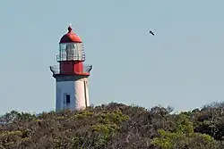 In 1865, Robben Island lighthouse was completed on Minto Hill.[26] The cylindrical masonry tower, which has an attached lightkeeper's house at its base, is 18 metres (59 ft) high with a lantern gallery at the top. In 1938, the lamp was converted to electricity. The lighthouse uses a flashing lantern instead of a revolving lamp; it shines for a duration of 5 seconds every seven seconds. The 46,000-candela beam, visible up to 44 kilometres (24 nmi) away, flashes white light away from Table Bay.[27] A secondary red light acts as a navigation aid for vessels sailing south-southeast.