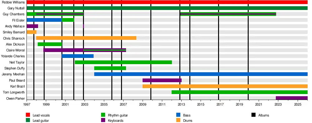 Robert Peter Williams (born 13 February 1974)[1] is an English singer and songwriter. He found fame as a member of the pop group Take That from 1990 to 1995, launching a solo career in 1996. His debut studio album, Life thru a Lens, was released in 1997, and included his best-selling single "Angels". His second album, I've Been Expecting You, featured the songs "Millennium" and "She's the One", his first and second number one singles. His discography includes seven UK No. 1 singles, and all but one of his 14 studio albums have reached No. 1 in the UK. Six of his albums are among the top 100 biggest-selling albums in the UK, with two of them in the top 60, and he gained a Guinness World Record in 2006 for selling 1.6 million tickets in a single day during his Close Encounters Tour.[2]