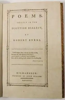 On 31 July 1786 John Wilson published the volume of works by Robert Burns, Poems, Chiefly in the Scottish dialect.[27] Known as the Kilmarnock volume, it sold for 3 shillings and contained much of his best writing, including "The Twa Dogs" (which features Luath, his Border Collie),[28] "Address to the Deil", "Halloween", "The Cotter's Saturday Night", "To a Mouse", "Epitaph for James Smith", and "To a Mountain Daisy", many of which had been written at Mossgiel farm. The success of the work was immediate, and soon he was known across the country.