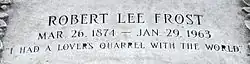 In the early hours of January 29, 1963, Frost died at Peter Bent Brigham Hospital in Boston, at the age of 88.[31] He was buried in the Old Bennington Cemetery in Bennington, Vermont. His epitaph, from the last line of his poem "The Lesson for Today" (1942), is: "I had a lover's quarrel with the world."