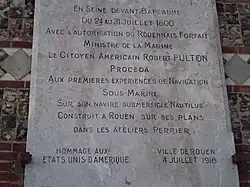 In 1797, Fulton went to Paris, where he was well known as an inventor. He studied French and German, along with mathematics and chemistry. Fulton also exhibited the first panorama painting to be shown in Paris, Pierre Prévost's Vue de Paris depuis les Tuileries (1800), on what is still called Rue des Panoramas (Panorama Street) today.[9] While living in France, Fulton designed the first working muscle-powered submarine, Nautilus, between 1793 and 1797. He also experimented with torpedoes. When tested, his submarine operated underwater for 17 minutes in 25 feet of water. He asked the government to subsidize its construction, but he was turned down twice. Eventually, he approached the Minister of Marine and, in 1800, was granted permission to build.[10] The shipyard Perrier in Rouen built it, and the submarine sailed first in July 1800 on the Seine River in the same city.