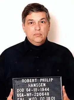 Robert Philip Hanssen (April 18, 1944 – June 5, 2023) was an American Federal Bureau of Investigation (FBI) agent who spied for Soviet and Russian intelligence services against the United States from 1979 to 2001. His espionage was described by the U.S. Department of Justice as "possibly the worst intelligence disaster in U.S. history".[2]
