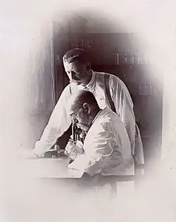 Koch began conducting research on microorganisms in a laboratory connected to his patient's examination room.[16] His early research in this laboratory yielded one of his major contributions to the field of microbiology, as he developed the technique of growing bacteria.[25] Furthermore, he managed to isolate and grow selected pathogens in a pure laboratory culture.[25] His discovery of the anthrax bacillus (later named Bacillus anthracis) hugely impressed Ferdinand Julius Cohn, professor at the University of Breslau (now the University of Wrocław), who helped him publish the discovery in 1876.[17] Cohn had established the Institute of Plant Physiology[26] and invited Koch to demonstrate his new bacterium there in 1877.[27] Koch was transferred to Breslau as district physician in 1879. A year after, he left for Berlin when he was appointed a government advisor at the Imperial Health Office, where he worked from 1880 to 1885.[28] Following his discovery of the tuberculosis bacterium, he was promoted to Geheimer Regierungsrat, a senior executive position, in June 1882.[29]