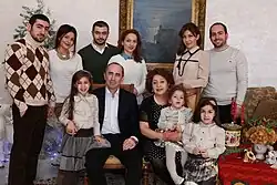 He and his wife, Bella Kocharyan, have three children: Sedrak, Gayane, and Levon, all of whom were born in Stepanakert. In addition to his native Armenian, Kocharyan speaks Russian and English.[58] In his memoirs that were published in 2020, he admitted to having a poor command of standard Armenian, saying that he "had difficulties with writing and reading in Armenian". He attributes this to his homeland of Karabakh, where many local Armenians speak the local Karabakh dialect or Russian as their first language.[34] Although he was baptized in the Armenian Apostolic Church by Archbishop Pargev Martirosyan in 1996, he has stated that he is not a believer.[59]
