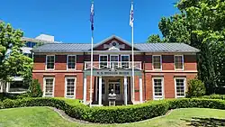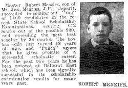 Growing up, Menzies and his siblings "had the normal enjoyments and camaraderies of a small country town".[9] He began his formal education in 1899 at the Jeparit State School, a single-teacher one-room school.[6] When he was about eleven, he and his sister were sent to Ballarat to live with his paternal grandmother; his two older brothers were already living there. In 1906, Menzies began attending the Humffray Street State School in Bakery Hill. The following year, aged 13, he ranked first in the state-wide scholarship examinations. This feat financed the entirety of his secondary education, which had to be undertaken at private schools, as Victoria did not yet have a system of public secondary schools.[10] In 1908 and 1909, Menzies attended Grenville College, a small private school in Ballarat Central.[11] He and his family moved to Melbourne in 1910, where he enrolled in Wesley College.[12] Menzies was "not very interested in and certainly incompetent at sport", but excelled academically. In his third and final year at Wesley he won a £40 exhibition for university study, one of 25 awarded by the state government.[13]
