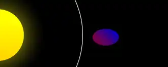 A celestial body (yellow) is orbited by a mass of fluid (blue) held together by gravity, here viewed from above the orbital plane. Far from the Roche limit (white line), the mass is practically spherical.