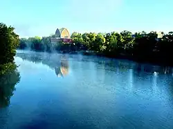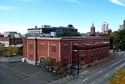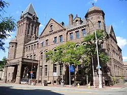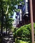 The 19th Ward is a southwest neighborhood bordered by Genesee Street, West Avenue, and the Erie Canal, and is across the river from the University of Rochester. The neighborhood is one of the largest in Rochester.[65][66] Now known by its slogan "Urban by Choice",[67] in the early 19th century, the area was known as Castle Town, after Castle Inn, a tavern run by Colonel Isaac Castle. By the early 1820s, however, the area was overshadowed by developments in the north that became downtown Rochester. Due to a tumultuous bend in the Genesee, the area was home to skilled boatsmen who assisted boats traveling north to Rochester and the area was consequently known during this time as "The Rapids".[68] In the 1890s, as Rochester expanded, the area rapidly urbanized. By 1930, it was a booming residential area for doctors, lawyers, and other skilled workers. Homes in the originally upper-class neighborhood typically have gumwood trim, leaded glass, fireplaces, hardwood floors, and open porches. In the 1960s, property values fell as the population of Rochester did, the area experienced white flight accelerated by school busing, blockbusting, and race riots downtown, and crime increased, with violence, drug use, and neglected property further diminishing property values.[69] In recent years, neighborhood revitalization has come from the "Brooks Landing" development along the Genesee River.[70] Gentrification has occurred in the 19th Ward and adjacent Plymouth-Exchange area from the conversion of housing stock to student housing for the University of Rochester.[71] Located in the 19th Ward are the Arvine Heights Historic District, Chili–West Historic District, Inglewood and Thurston Historic District, and Sibley–Elmdorf Historic District, listed on the National Register of Historic Places.[72][73][74]