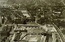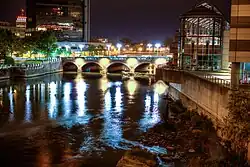 During World War II, Rochester factories produced a variety of goods for the war effort, including fuel tanker ships, optical equipment, and radio proximity fuses, amounting to US$1,200,000,000 of military orders.[46] Following the war, the city began engaging in urban renewal projects to revitalize downtown, including the construction of Midtown Plaza and freeways like the Inner Loop, and the demolition of the Front Street neighborhood.[47] By the 1970s, the city experienced highway revolts against new projects,[48] and in the 2010s, the city began filling in the Inner Loop to restore older neighborhoods.[49]