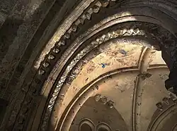 Cormac's Chapel, the chapel of King Cormac Mac Carthaigh, was begun in 1127 and consecrated in 1134.[6] It is a sophisticated structure, with vaulted ceilings and wide arches, drawing on contemporary European architecture and infusing unique native elements. The Irish Abbot of Regensburg, Dirmicius of Regensburg, sent two of his carpenters to help in the work and the twin towers on either side of the junction of the nave and chancel are strongly suggestive of their Germanic influence, as this feature is otherwise unknown in Ireland. Other notable features of the building include interior and exterior arcading, a barrel-vaulted roof, a carved tympanum over both doorways, the magnificent north doorway, ogive arched chancel and the oldest stairs in Ireland. It contains the only surviving Romanesque frescoes in Ireland.[8] The chapel was constructed primarily of sandstone which has become waterlogged over the centuries, significantly damaging the interior frescoes. Restoration and preservation required the chapel be completely enclosed in a rain-proof structure with interior dehumidifiers to dry out the stone. It is now open for limited tours to the public.