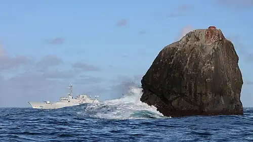 In 1956, British scientist James Fisher referred to Rockall as "the most isolated small rock in the oceans of the world".[27] An all round navigational beacon was first installed on Rockall's summit in 1972.[28] Rockall's location was precisely determined by Nick Hancock during his 2014 expedition.[29]