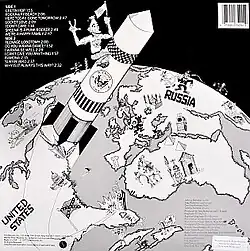 The album was released on November 4, 1977, under the name Rocket to Russia, although it had a working title of Get Well.[11] John Gillespie directed the artwork on the album, and the cover photo was taken by Danny Fields. The photo was taken in Extra Place, an alley in East Village, Manhattan.[17] Arturo Vega is credited as Artistic Coordinator, and Punk magazine editor John Holmstrom illustrated for the album.[16] Holmstrom and Johnny collaborated on the back cover's concept, eventually conceiving a military theme with an anti-communist cartoon drawing. The back cover art depicts a "pinhead" riding a rocket from the United States to Russia. The drawing features many landmarks which pertain to their global position, including The Empire State Building and Capitol Building, and Saint Basil's Cathedral in Moscow, along with highly stereotypical caricatures of certain ethnicities. The original artwork is now featured in the Rock and Roll Hall of Fame in Cleveland, Ohio. The inside sleeve features cartoon illustrations of each song's basic concept.[18][19]