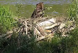 A strategy for dealing with seasonal plenty is to eat as much as possible and store the surplus nutrients as fat. Marmots do this, and may be 50% heavier in the autumn than in the spring. They rely on their fat reserves during their long winter hibernation.[33] Beavers feed on the leaves, buds, and inner bark of growing trees, as well as aquatic plants. They store food for winter use by felling small trees and leafy branches in the autumn and immersing them in their pond, sticking the ends into the mud to anchor them. Here, they can access their food supply underwater even when their pond is frozen over.[34]