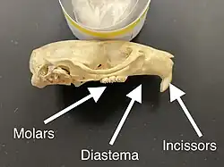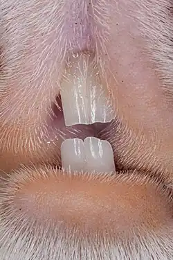 The distinguishing feature of the rodents is their pairs of continuously growing, razor-sharp, open-rooted incisors.[1] These incisors have thick layers of enamel on the front and little enamel on the back.[2] Because they do not stop growing, the animal must continue to wear them down so that they do not reach and pierce the skull. As the incisors grind against each other, the softer dentine on the rear of the teeth wears away, leaving the sharp enamel edge shaped like the blade of a chisel.[3] Rodent species have 12–28 teeth total, usually 22, with no canines. A gap, or diastema, occurs between the incisors and the cheek teeth in most species. This allows rodents to suck in and seal their mouth from inedible material.[1] Chinchillas and guinea pigs have a high-fiber diet; their molars have no roots and grow continuously like their incisors.[4]