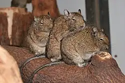 Rodents, like all placental mammals except primates, have just two types of light receptive cones in their retina,[59] a short wavelength "blue-UV" type and a middle wavelength "green" type. They are therefore classified as dichromats; however, they are visually sensitive into the ultraviolet (UV) spectrum and therefore can see light that humans cannot. The functions of this UV sensitivity are not always clear. In degus, for example, the belly reflects more UV light than the back. Therefore, when a degu stands up on its hind legs, which it does when alarmed, it exposes its belly to other degus and ultraviolet vision may serve a purpose in communicating the alarm. When it stands on all fours, its low UV-reflectance back could help make the degu less visible to predators.[60] Ultraviolet light is abundant during the day but not at night. There is a large increase in the ratio of ultraviolet to visible light in the morning and evening twilight hours. Many rodents are active during twilight hours (crepuscular activity), and UV-sensitivity would be advantageous at these times. Ultraviolet reflectivity is of dubious value for nocturnal rodents.[61]