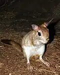 Rodent species use a wide variety of methods of locomotion including quadrupedal walking, running, burrowing, climbing, bipedal hopping (kangaroo rats and hopping mice), swimming and even gliding.[3] Scaly-tailed squirrels and flying squirrels, although not closely related, can both glide from tree to tree using parachute-like membranes that stretch from the fore to the hind limbs.[12] The agouti is fleet-footed and antelope-like, being digitigrade and having hoof-like nails. The majority of rodents have tails, which can be of many shapes and sizes. Some tails are prehensile, as in the Eurasian harvest mouse, and the fur on the tails can vary from bushy to completely bald. The tail is sometimes used for communication, as when beavers slap their tails on the water surface or house mice rattle their tails to indicate alarm. Some species have vestigial tails or no tails at all.[1] In some species, the tail is capable of regeneration if a part is broken off.[3]