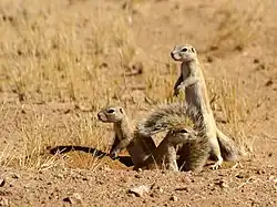 Among the most social of rodents are the ground squirrels, which typically form colonies based on female kinship, with males dispersing after weaning and becoming nomadic as adults. Cooperation in ground squirrels varies between species and typically includes making alarm calls, defending territories, sharing food, protecting nesting areas, and preventing infanticide.[44] The black-tailed prairie dog forms large towns that may cover many hectares. The burrows do not interconnect, but are excavated and occupied by territorial family groups known as coteries. A coterie often consists of an adult male, three or four adult females, several nonbreeding yearlings, and the current year's offspring. Individuals within coteries are friendly with each other, but hostile towards outsiders.[39]