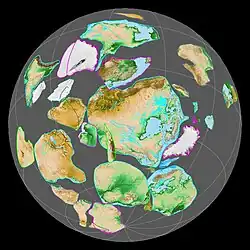 Little is known about the paleogeography before the formation of Rodinia. Paleomagnetic and geologic data are only definite enough to form reconstructions from the breakup of Rodinia[18] onwards. Rodinia is considered to have formed between 1.3 and 1.23 Ga and broke up again before 750 Ma.[19] Rodinia was surrounded by the superocean Mirovia.