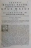 While faculties of the time were largely limited to addressing disputes on the known texts of Aristotle, Clement's patronage permitted Bacon to engage in a wide-ranging consideration of the state of knowledge in his era.[19] In 1267 or '68, Bacon sent the Pope his Opus Majus, which presented his views on how to incorporate Aristotelian logic and science into a new theology, supporting Grosseteste's text-based approach against the "sentence method" then fashionable.[19]