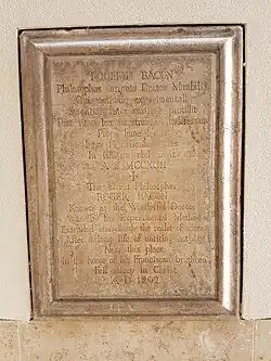 In Oxford lore, Bacon is credited as the namesake of Folly Bridge for having been placed under house arrest nearby.[149] Although this is probably untrue,[150] it had formerly been known as "Friar Bacon's Bridge".[151] Bacon is also honoured at Oxford by a plaque affixed to the wall of the Westgate shopping centre.[149]