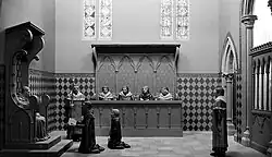 To commemorate the 700th anniversary of Bacon's approximate year of birth, Prof. J. Erskine wrote the biographical play A Pageant of the Thirteenth Century, which was performed and published by Columbia University in 1914.[152][153] A fictionalised account of Bacon's life and times also appears in the second book of James Blish's After Such Knowledge trilogy, the 1964 Doctor Mirabilis.[154] Bacon serves as a mentor to the protagonists of Thomas Costain's 1945 The Black Rose,[155][156] and Umberto Eco's 1980 The Name of the Rose.[157] Greene's play prompted a less successful sequel John of Bordeaux and was recast as a children's story for James Baldwin's 1905 Thirty More Famous Stories Retold.[158] "The Brazen Head of Friar Bacon" also appears in Daniel Defoe's 1722 Journal of the Plague Year, Nathaniel Hawthorne's 1843 "The Birth-Mark" and 1844 "The Artist of the Beautiful", William Douglas O'Connor's 1891 "The Brazen Android" (where Bacon devises it to terrify King Henry into accepting Simon de Montfort's demands for greater democracy),[159][160] John Cowper Powys's 1956 The Brazen Head, and Robertson Davies's 1970 Fifth Business.[161] Bacon appears in Rudyard Kipling's 1926 story 'The Eye of Allah'.