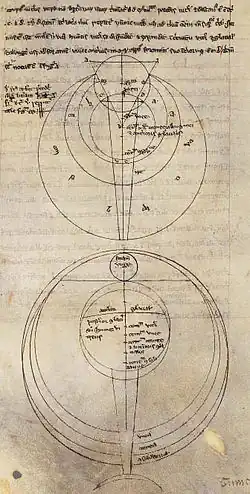 It was not intended as a complete work but as a "persuasive preamble" (persuasio praeambula), an enormous proposal for a reform of the medieval university curriculum and the establishment of a kind of library or encyclopedia, bringing in experts to compose a collection of definitive texts on these subjects.[43] The new subjects were to be "perspective" (i.e., optics), "astronomy" (inclusive of astronomy proper, astrology, and the geography necessary to use them), "weights" (likely some treatment of mechanics but this section of the Opus Majus has been lost), alchemy, agriculture (inclusive of botany and zoology), medicine, and "experimental science", a philosophy of science that would guide the others.[43] The section on geography was allegedly originally ornamented with a map based on ancient and Arabic computations of longitude and latitude, but has since been lost.[44] His (mistaken) arguments supporting the idea that dry land formed the larger proportion of the globe were apparently similar to those which later guided Columbus.[44]