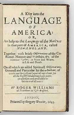 Williams's career as an author began with A Key into the Language of America (London, 1643), written during his first voyage to England. His next publication was Mr. Cotton's Letter lately Printed, Examined and Answered (London, 1644; reprinted in Publications of the Narragansett Club, vol. ii, along with John Cotton's letter which it answered). His most famous work is The Bloudy Tenent of Persecution for Cause of Conscience (published in 1644), considered by some to be one of the best defenses of liberty of conscience.[75]