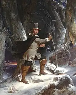 Finally, the General Court tried Williams in October 1635 and convicted him of sedition and heresy. They declared that he was spreading "diverse, new, and dangerous opinions"[30] and ordered that he be banished. The execution of the order was delayed because Williams was ill and winter was approaching, so he was allowed to stay temporarily, provided that he ceased publicly teaching his opinions. He did not comply with this demand, and the sheriff came in January 1636, only to discover that he had slipped away three days earlier during a blizzard. He traveled 55 miles on foot through the deep snow, from Salem to Raynham, Massachusetts, where the local Wampanoags offered him shelter at their winter camp. Sachem Massasoit hosted Williams there for the three months until spring.[31]
