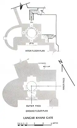 The gate may have been built in two stages.[2] It consists of an inner and outer gate that encloses a stepwell.[2] Its opening is 3.15 meters (10.3 feet) wide and is flanked by two bastions on either side. The gate has five battlements on top, with stairs leading up the outside wall. South of the gate is the Shahi Mosque, so many call it the Shahi Darwaza.