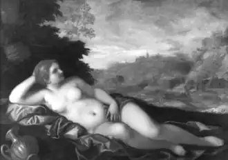 In 17th-century Spanish art, even in the depiction of sibyls, nymphs, and goddesses, the female form was always chastely covered. No painting from the 1630s or 1640s, whether in the genre, portrait, or history format, shows a Spanish female with her breasts exposed; even uncovered arms were only rarely shown.[33] In 1997, the art historian Peter Cherry suggested that Velázquez sought to overcome the contemporary requirement for modesty by portraying Venus from the back.[43] Even in the mid-18th century, an English artist who made a drawing of the Venus when it was in the collection of the Dukes of Alba noted it was "not hung up, owing to the subject".[44]