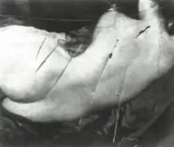 Richardson was sentenced to six months' imprisonment, the maximum allowed for destruction of an artwork.[71] In a statement to the Women's Social and Political Union shortly afterwards, Richardson explained, "I have tried to destroy the picture of the most beautiful woman in mythological history as a protest against the Government for destroying Mrs. Pankhurst, who is the most beautiful character in modern history."[70][72] She added in a 1952 interview that she did not like "the way men visitors gaped at it all day long".[73] The feminist writer Lynda Nead wrote that the incident "symbolized a particular perception of feminist attitudes towards the female nude; in a sense, it has come to represent a specific stereotypical image of feminism more generally."[74] Contemporary reports of the incident reveal that the picture was not widely seen as mere artwork. Journalists tended to assess the attack in terms of a murder (Richardson was nicknamed "Slasher Mary"), and used words that conjured wounds inflicted on an actual female body, rather than on a pictorial representation of a female body.[71] The Times described a "cruel wound in the neck", as well as incisions to the shoulders and back.[75]