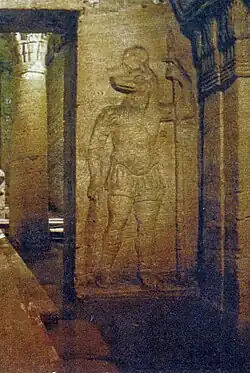 The imperially-appointed archiereus for Alexandria and All Egypt was responsible for the administrative management of the temples, beyond those of the imperial cult, dedicated to Graeco-Roman deities and the ancient Egyptian gods.[31]: 95 He controlled access to the priesthoods of the Egyptian cults: the ritual circumcision of candidates was subject to his approval and he mediated disputes involving temples, wielding some judicial powers.[31]: 93 As sponsors of temple cults, emperors appeared in traditional pharaonic regalia on carved temple reliefs.[32]: 435 Similarly, Egyptian gods were sometimes shown wearing Roman military garb, particularly Anubis and Horus.[34]: 439
