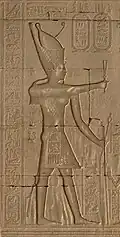 "Gate of Domitian and Trajan" at the northern entrance of the Temple of Hathor, and Roman emperor Domitian as Pharaoh of Egypt on the same gate, together with Egyptian hieroglyphs[105]