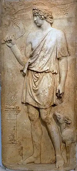 The emperor Hadrian's Hispano-Roman origins and marked pro-Hellenism changed the focus of imperial cult. His standard coinage still identifies with the genius populi Romani, but other issues stress his identification with Hercules Gaditanus (Hercules of Gades), and Rome's imperial protection of Greek civilisation.[116] Commemorative coinage shows him "raising up" provincial deities (thus elevating and "restoring" the provinces); he promoted Sagalassos in Greek Pisidia as the Empire's leading imperial cult centre and in 131–2 AD he sponsored the exclusively Greek Panhellenion.[117] He was said to have "wept like a woman" at the death of his young lover Antinous, and arranged his apotheosis. Dio claims that Hadrian was held to ridicule for this emotional indulgence, particularly as he had delayed the apotheosis of his own sister Paulina after her death.[118]