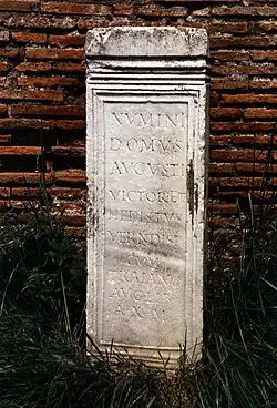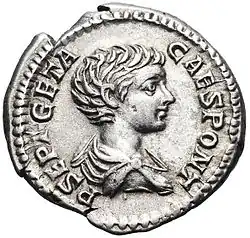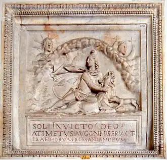 Severus' reign represents a watershed in relations between Senate, emperors, and the military.[137] Senatorial consent defined divine imperium as a republican permission for the benefit of the Roman people, and apotheosis was a statement of senatorial powers. Where Vespasian had secured his position with appeals to the genius of the Senate and Augustan tradition, Severus overrode the customary preferment of senators to senior military office. He increased plebeian privilege in Rome, stationed a loyal garrison there and selected his own commanders. He paid personal attention to the provinces, as sources of revenue, military manpower and unrest. Following his defeat of his rival Clodius Albinus at Lugdunum, he re-founded and reformed its imperial cult centre: dea Roma was removed from the altar and confined to the temple along with the deified Augusti.[138] Fishwick interprets the obligatory new rites as those due any pater familias from his inferiors.[139] Severus' own patron deities, Melqart/Hercules and Liber/Bacchus, took pride of place with himself and his two sons at the Secular Games of 204 AD.[140] Severus died of natural causes in 211 AD at Eboracum (modern York) while on campaign in Britannia, after leaving the Empire equally to Caracalla and his older brother Geta, along with advice to "be harmonious, enrich the soldiers, and scorn all other men."[141]