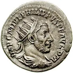 Maximinus Thrax (reigned 235–8 AD) sequestered the resources of state temples in Rome to pay his armies. The temples of the divi were first in line. It was an unwise move for his own posterity, as the grant or withholding of apotheosis remained an official judgment of Imperial worthiness, but the stripping of the temples of state gods caused far greater offense. Maximinus's actions more likely show need in extreme crisis than impiety, as he had his wife deified on her death,[151] but in a rare display of defiance the Senate deified his murdered predecessor, then openly rebelled.[152] His replacement, Gordian I, reigned briefly but successfully and was made a divus on his death. A succession of short-lived soldier-emperors followed. Further development in imperial cult appears to have stalled until Philip the Arab, who dedicated a statue to his father as divine in his home town of Philippopolis and brought the body of his young predecessor Gordian III to Rome for apotheosis. Coins of Philip show him in the radiate crown (suggestive of solar cult or a Hellenised form of imperial monarchy), with Rome's temple to Venus and dea Roma on the reverse.[153]