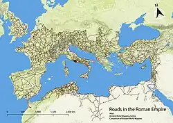 A road map of the empire reveals that it was generally laced with a dense network of prepared viae.[9] Beyond its borders there were no paved roads; however, it can be supposed that footpaths and dirt roads allowed some transport.[9] There were, for instance, some pre-Roman ancient trackways in Britain, such as the Ridgeway and the Icknield Way.[10]