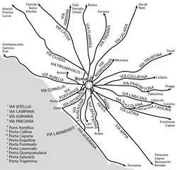 - These roads bear the names of their constructors (e.g. Via Appia, Cassia, Flaminia).[9]