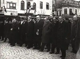 The interior wing began organizing itself as a more efficient conspiratorial network through regained Comintern control.[38] The onset of the Great Depression in Romania, and the series of strikes infiltrated (and sometimes provoked) by the interior wing signified relative successes (see Lupeni Strike of 1929), but gains were not capitalized—as lack of ideological appeal and suspicion of Stalinist directives remained notable factors.[39] In parallel, its leadership suffered changes that were meant to place it under an ethnic Romanian and working-class leadership—the emergence of a Stalin-backed group around Gheorghe Gheorghiu-Dej before and after the large-scale Grivița Strikes.[40][41]