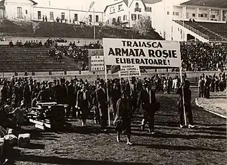 In early 1944, as the Red Army reached and crossed the Prut River during the Second Jassy–Kishinev Offensive, the self-confidence and status gained by the PCdR made possible the creation of the Bloc, which was designed as the basis of a future anti-Axis government.[70] Parallel contacts were established, through Lucrețiu Pătrășcanu and Emil Bodnăraș, between the PCdR, the Soviets, and King Michael.[71] A seminal event also occurred during those months: Ștefan Foriș, who was still general secretary, was deposed by with Soviet approval by the rival "prison faction"(at the time, it was headed by former inmates of Caransebeș prison); replaced with the troika formed by Gheorghe Gheorghiu-Dej, Constantin Pîrvulescu, and Iosif Rangheț, Foriș was discreetly assassinated in 1946.[72] Several assessments view Foriș's dismissal as the complete rupture in historical continuity between the PCdR established in 1921 and what became the ruling party of Communist Romania.[73]