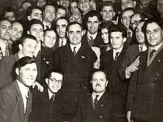 In 1934, Stalin's Popular Front doctrine was not fully passed into the local party's politics, mainly due to the Soviet territorial policies (culminating in the 1939 Molotov–Ribbentrop Pact) and the widespread suspicion other left-wing forces maintained toward the Comintern.[42][43] The Communists did, nevertheless, attempt to reach consensus with other groupings on several occasions (in 1934–1943, they established alliances with the Ploughmen's Front, the Hungarian People's Union, and the Socialist Peasants' Party), and small Communist groups became active in the leftist sections of mainstream parties.[44] In 1934, Petre Constantinescu-Iași and other PCdR supporters created Amicii URSS, a pro-Soviet group reaching out to intellectuals, itself banned later in the same year.[45][46]
