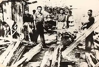 As Romania came under the rule of Ion Antonescu and, as an Axis country, joined in the German offensive against the Soviets, the Communist Party began approaching traditional parties that were engaged in semi-clandestine opposition to Antonescu: alongside the Social Democrats, it began talks with the National Peasants' and the National Liberal parties. At the time, virtually all the interior leadership was imprisoned at various locations (most of them interned at Caransebeș or in a concentration camp near Târgu Jiu).[64] Some communists, such as Petre Gheorghe, Filimon Sârbu, Francisc Panet or Ștefan Plavăț, tried to establish organised resistance groups; however, they were quickly captured by the Romanian authorities and executed, as were some of the more active propagandists, such as Pompiliu Ștefu. A statistic of the Siguranţa reports that, in Bucharest, between January 1941 and September 1942, 143 individuals were tried for communism, of which 19 were sentenced to death and 78 to prison terms or forced labour.[65] The antisemitic Antonescu regime established a distinction between PCdR members of Jewish Romanian origin and those of ethnic Romanian or other heritage, deporting the majority of the former, alongside Romanian and Bessarabian Jews in general, to camps, prisons and makeshift ghettos in occupied Transnistria (see Holocaust in Romania).[66] Most Jews from the PCdR category were held in Vapniarka, where improper feeding caused an outbreak of paralysis, and in Rîbnița, where some 50 were victims of the authorities' criminal negligence and were shot by retreating German troops in March 1944.[67]