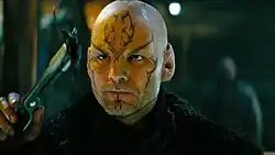 In the 2009 Abrams reboot film, titled Star Trek, the planet Romulus is destroyed by a supernova in the year 2387. A Romulan mining ship, the Narada, survives and travels back in time to the 23rd century; its commander, Nero (Eric Bana), is committed to destroying the planet Vulcan to punish Spock for failing to save Romulus. The actors playing Romulans in this film wore three prosthetics applied to their ears and foreheads, while Bana had a fourth prosthetic for the bitemark on his ear that extends to the back of his character's head.[20] The film's Romulans lacked the V-shaped ridges on the foreheads, which had been present in all of their depictions outside the original series. Neville Page wanted to honor that by having Nero's crew ritually scar themselves too, forming keloids reminiscent of the "V"-ridges. It was abandoned as they did not pursue the idea enough.[21]