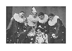 About the same time Colman joined the London Scottish, he took to the stage and soon established himself as a member of the performing community in Ealing. Between 1909 and 1914, Colman appeared solo and with various concert parties and amateur dramatics groups. He began with banjo solos at benefit concerts[27] and two years later joined the short-lived Pierrot troupes The Tangerines[28] and The Summer 'Uns, who only had one performance.[29] In 1912, while on the Isle of Wight, Colman and some friends formed The Mad Medicos,[30] who performed under his direction.[31] A part of this troupe then became The Popinjays, again under Colman’s direction, until George Denby (c. 1889-1951)[32] took over.[33] Besides banjo solos and duets, Colman's repertoire included songs and duets like "Two Little Sausages" (Lionel Monckton) and musical monologues, recitals of poems like The Green Eye of the Little Yellow God, funny stories and above all character sketches from Dickens such as Uriah Heep, John Brodie and Martin Chuzzlewit. At "An Evening With Dickens", Colman played Charles Darnay in three scenes from A Tale of Two Cities.[34] He also staged three pieces of his own: the duologues "My Pierrot"[35] and "A Knotty Problem"[36] and the miniature revue "Come Inside".[37] When Colman rejoined the Popinjays in July 1916 for performances at the Pavilion in Derby, between theatre engagements, there was a marked change in his repertoire: The character sketch was now of a Chelsea Pensioner, and he recited Spotty, a Tale of the Trenches.[38]
