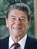 White House portrait of Reagan smiling in front of the U.S. and U.S. president flags, wearing a dark blue suit jacket with a white shirt and burgundy necktie.